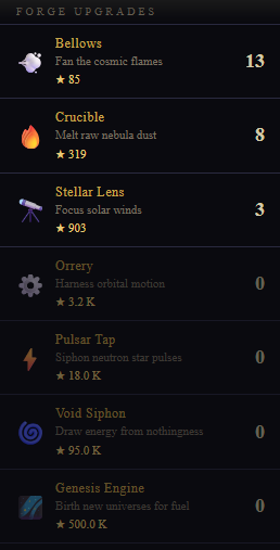 Welcome to Star Forge — click the star-anvil to hammer raw cosmic energy into stars, then invest your stars into forge upgrades to automate production.