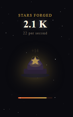 Clicking — each click on the anvil forges stars. Sparks fly and a floating counter shows your yield. The orange heat bar fills as you click.